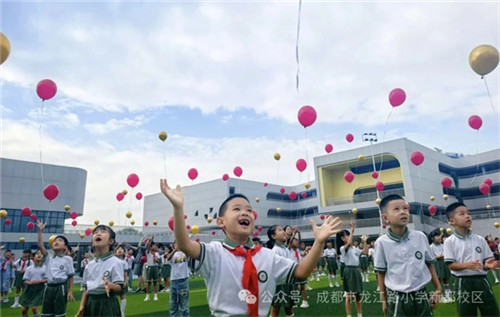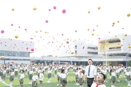 典礼在《我和我的祖国》的歌声中推向高潮,孩子们放飞手中的金色、红色气球,气球带着初心与梦想飞向蓝天,也为新学期画上了充满希望的开篇。