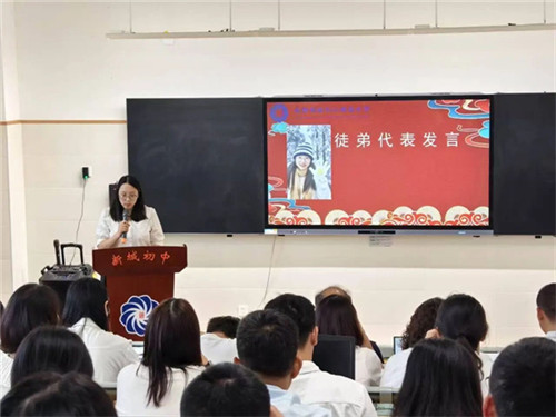徒弟们手捧鲜花,有序走上台,向各自的师傅行拜师礼,拜师礼后,全体师徒在刘昆明老师的带领下,共同宣读学校教师誓词:“修身为善育学子,习是正学积学养,风范雅正有大我,学术日深留芬芳。” 铿锵有力的誓言回荡在会场,不仅是对教育初心的坚守,更是对师徒共同成长的承诺。