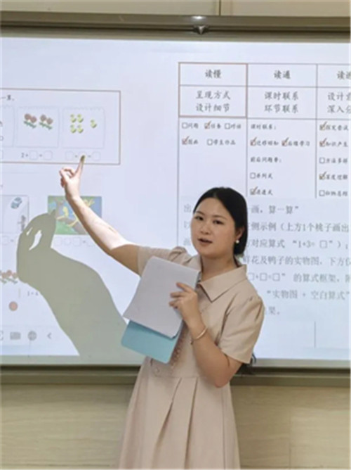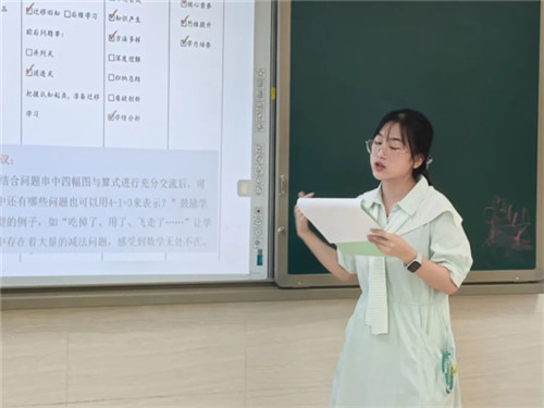 一年级数学组邹瑞焓、刘秀娟老师以“拆解教材、点亮数智”为主题,解读上册第二单元《5以内数加与减》,聚焦核心素养,挖掘重难点并研究突破策略;二年级赵欣愉老师以《图书馆》一课为例,剖析教材编写意图,梳理课时间的结构化联系。