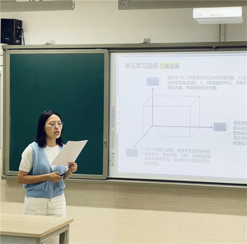 胥娜娜老师宏观综述五年级上册教材,重点分析第三单元《倍数与因数》;巫月圆老师以该单元第一课时为例,分享如何将抽象概念转化为可操作的学习任务。五、六年级教师团队还针对北师大版教材各单元重难点展开全面解读。
