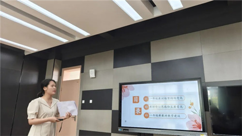 一年级语文组围绕上册新教材展开深入交流。谢妮倍老师结合2022年版《义务教育语文课程标准》,梳理教材框架结构的主要变化;伍晓芹老师从强化育人导向、注重幼小衔接等四方面分享修订思路;袁云超老师提供实用教学建议;周玉金老师则针对第一单元进行细致分析,探索图文趣味识字与文化自信培养的融合路径。