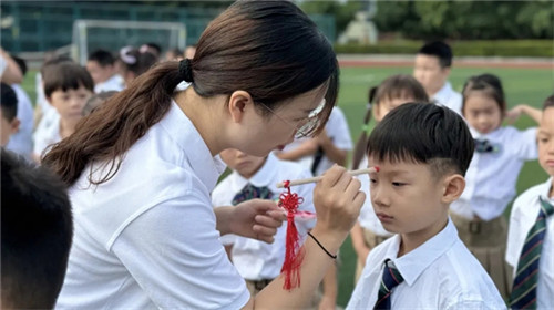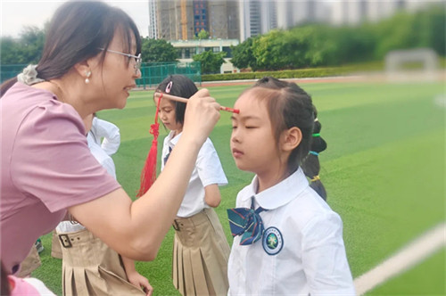 一年级新生参加了传统“开笔礼”仪式。孩子们在老师引导下正衣冠,学做整洁、识礼的小学生;行拜师礼,表达对万世师表的崇高敬意;额点朱砂,寓意启蒙开智。