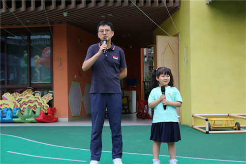 本次仪式由大五班小朋友徐沁昀和她的爸爸共同担任主持。“尊敬的老师,亲爱的小朋友们,大家早上好!” 伴随着稚嫩又响亮的声音,本次升旗仪式的亲子主持组合登场了。稚嫩的童声与温柔的男声交织,诉说着对老师最真诚的感恩,亲子间的默契配合,让开场就充满了爱的温暖。