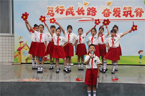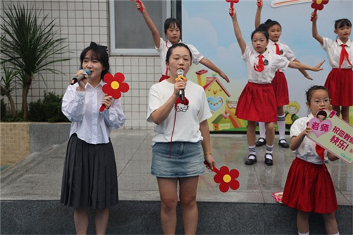若说快板是“声”的赞美,那接下来的歌舞《送你一朵小红花》便是“情”的共鸣。李俊峰校长、郑婉彤妈妈、王秋妹老师、彭丽红老师共同登台,家校师三方携手,用歌声传递心意。