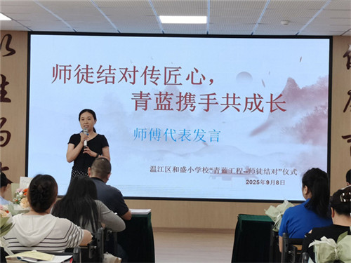 2025年9月8日,金秋的校园桂香馥郁,成都市温江区和盛小学全体教师齐聚致远楼会议室,一场师徒结对仪式如期举行。此次结对是学校“青蓝工程”的重要实践,该工程是传承匠心、激活队伍的关键纽带,为青年教师成长铺设坚实阶梯。
