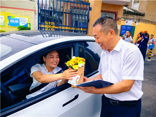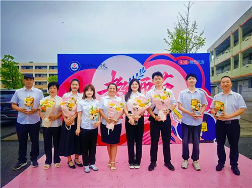 9月10日清晨,中山小学全体教职工入校时,学校行政班子手捧鲜花列队迎接,为每位教师送上节日祝福,温馨氛围溢满校园。