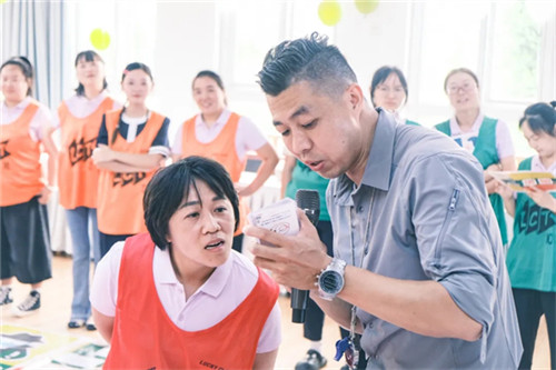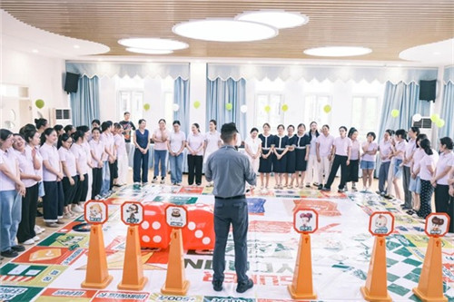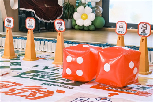 电影结束后,“真人版大富翁”游戏欢乐开场。老师们自由组队,化身“首领”“幸运星”“财务”等角色,一起投色子、闯关卡、赚“财富”。
