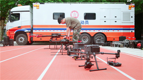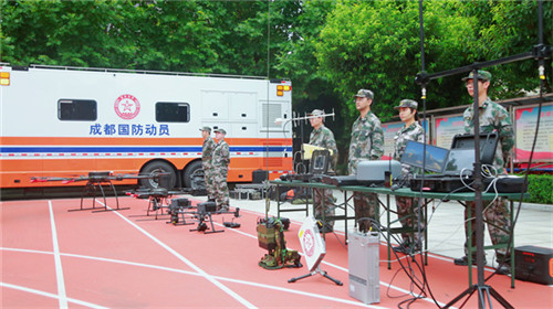 疏散演练后,活动进入了令人振奋的国防装备展示环节。成都市国动办、应急局带来的各类专业车辆、无人机、卫星通信设备等“硬核”装备一字排开,让学生们大开眼界。