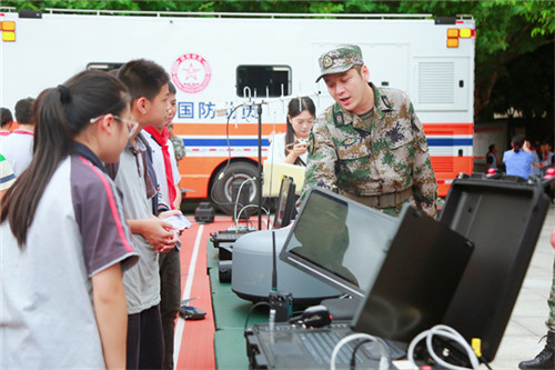 学校老师与工作人员组织一部分学生分批次、按秩序参观了国防动员车辆,庞大的车身和精密的设备引发了同学们阵阵惊叹;还有一部分同学则驻足于宣传展板和无人机等装备前,好奇地聆听专业人员的讲解。这种与国防“黑科技”零距离接触的机会,极大地激发了同学们对现代国防科技的兴趣,一颗颗“强国梦”的种子在心中悄然生根发芽。