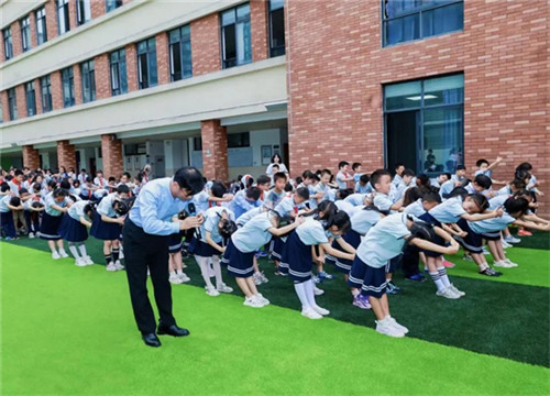 随后,在袁辉的带领下,全校学生面向老师行拜师礼。孩子们郑重躬身,用最传统的方式表达对老师的崇高敬意。这一刻,感恩的种子在幼小的心灵中生根发芽,这庄严的仪式,让尊师重教的传统美德深深烙印在每个孩子的生命记忆中。