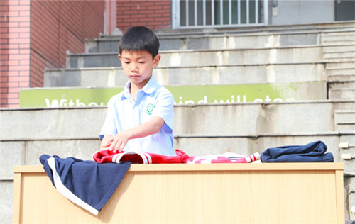 二年级的10位小选手现场展示叠衣技能,他们手法娴熟、动作利落,展现出积极向上的劳动风貌,赢得了台下阵阵喝彩。