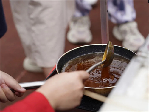 不止是看客,锦外娃也可以做一回非遗“手艺人”。精彩绝伦的非遗表演后,操场秒变大型“非遗体验馆”,处处是甜甜的香味和五彩斑斓的手工艺品。老师领着这群“小好奇”,体验了一个又一个非遗项目。