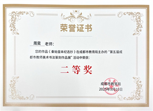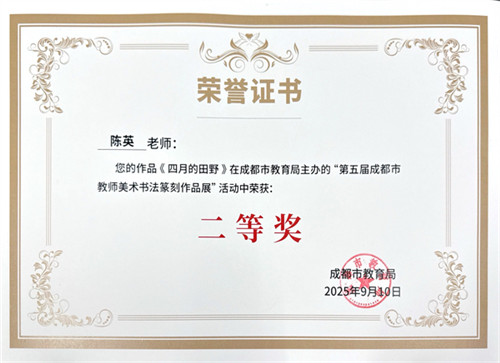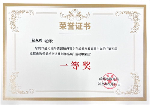 在第五届成都市教师美术书法篆刻作品展中,经各区(市)县推荐、专家团严格评审,学校纪永秀、陈英、周奕三位美术教师,凭借深厚的艺术积淀与独特的创作视角,于众多佳作中脱颖而出,共荣获一等奖1项,二等奖2项,尽显百年名校深厚的艺术底蕴与不凡实力。