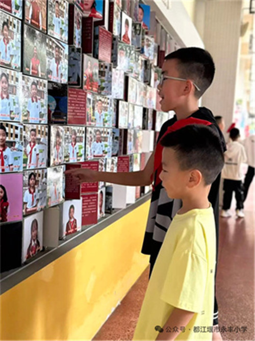接着,大家穿过彩虹长廊,食堂和蒲公英超市出现在眼前。食堂边的过道,记录着永丰学子的日常点滴。哥哥姐姐们拉着弟弟妹妹的手,指着墙上的照片,讲述着校园里的趣事,让一年级的小朋友对未来的校园生活充满期待。