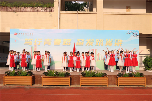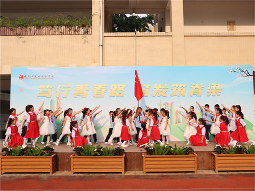 三(4)中队的队员们带来诗朗诵《勿忘九一八》。同学们的朗诵极具感染力,让在场师生深刻感受到那段历史的沉重与先辈的英勇。在诗朗诵后,学校舞蹈队带来《五星红旗迎风飘扬》舞蹈表演。