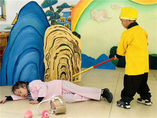 在常规语言教学里,部分幼儿因自我效能感低、社交焦虑,面对教师提问会防御性回避,不愿表达。《3-6岁儿童学习与发展指南》指出:需为幼儿打造丰富多样的语言运用场景,促进他们在实践中提升语言表达与沟通能力。通过开展《西游记之三打白骨精》戏剧游戏,孩子们参与热情度高,曾经抗拒表达的幼儿克服心理障碍,语言发展进步更加显著。