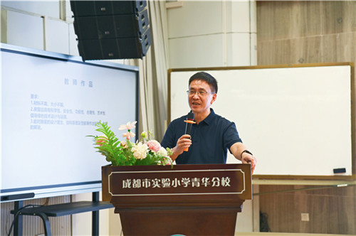随后,成都市实验小学明道分校周小松老师聚焦成都市2025年小学科学创新主题活动——“智造房子”现场赛,从活动的核心价值与实践意义展开深度解读。他提出,要引导学生将科学原理与生活需求深度融合,让学生在动手实践的过程中,同步提升科学素养与绿色环保意识,真正落地“以赛促学、以创育人”的活动目标。