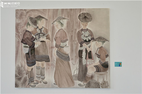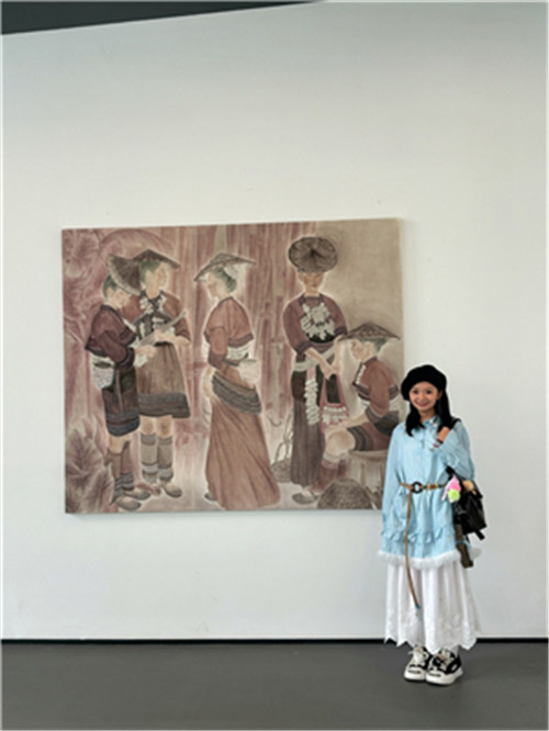 黄麒颖老师获奖的作品《六月》(尺寸:2m×1.63m)以云南花腰傣为创作主题,生动刻画了花腰傣族的人物形象与特色服饰——花腰傣因腰间华丽的服饰装饰而得名。作品不仅呈现民族美学,更诠释了少数民族敬畏自然、坚守传统的精神内核,为现代社会的可持续发展提供了珍贵的文化参照。