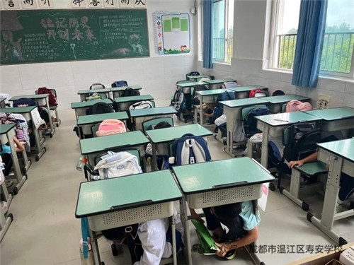 上午10:00,随着第一声凄厉的防空警报骤然响起,全校师生立即进入应急就地避险状态。教室内的学生迅速蹲下,双手护头,躲避在结实的课桌下;办公室内的教师也同样利用办公桌进行紧急避险。