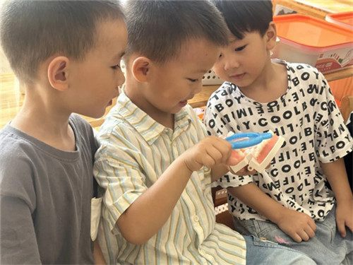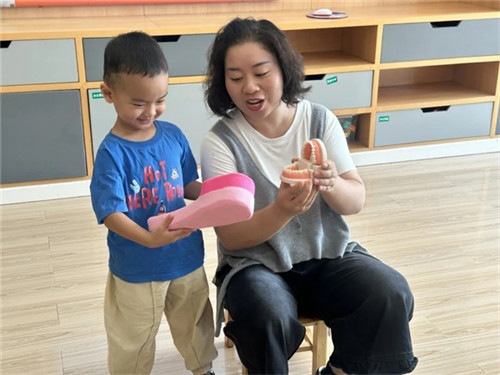 孩子们围在牙齿模型旁,睁着好奇的大眼睛,一边“看一看”牙齿的形状,一边“摸一摸”感受牙齿的硬度,你一言我一语,轻松认识了自己的小牙齿,知道要好好爱护它们啦!