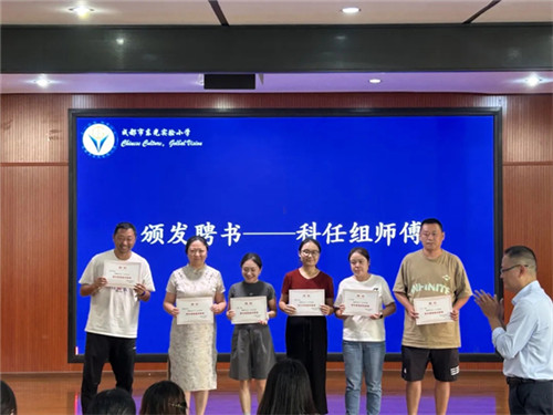校长助理周薇宣读本学年师徒结对名单,新的师徒组合正式诞生。教导处主任杨蓝详细解读工作安排与考核标准。随后,校长杨莉、副校长王晓杨及校长助理何少东分别为语文组、数学组、科任组的师傅们颁发聘书。