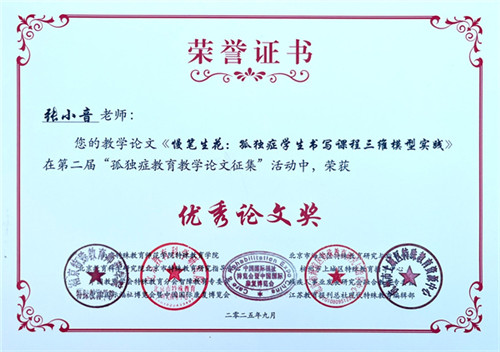 张小音老师的教学论文《慢笔生花:孤独症学生书写课程三维模型实践》荣获优秀论文奖。