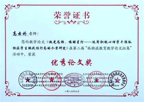 高云娇老师的教学论文《执光为炬,唤醒星河——运用积极心理学干预孤独症学生挑战性行为的个案研究》荣获优秀论文奖。