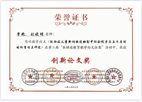 曾艳、刘晓明老师的教学论文《孤独症儿童新词快速映射中社会线索与互斥原则的权重特点研究》荣获创新论文奖。