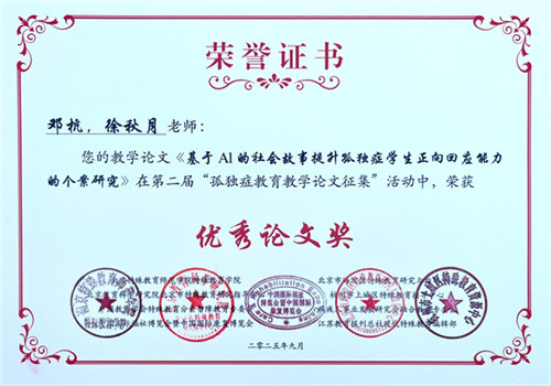 邓杭、徐秋月老师的教学论文《基于AI的社会故事提升孤独症学生正向回应能力的个案研究》荣获优秀论文奖。