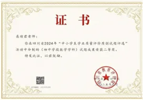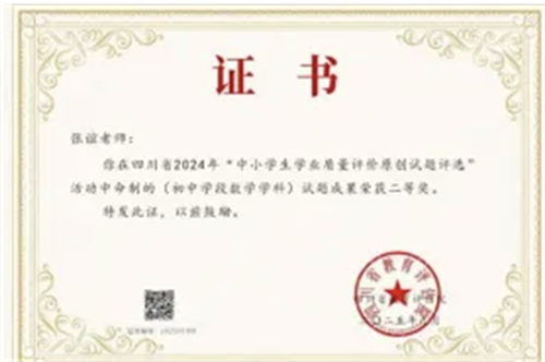 9月,四川省大邑县安仁中学以课题引领教研喜获硕果:初中数学组教师张谊在四川省2024年“中小学学业质量评价原创试题”活动中命制的试题荣获省级二等奖!一同获奖的还有安仁中学教育集团联盟校成员学校韩场学校聂绪君老师。