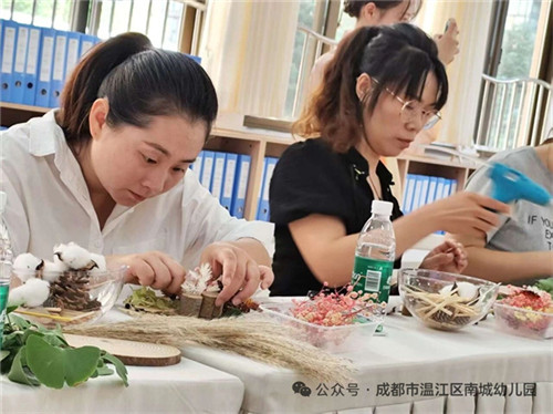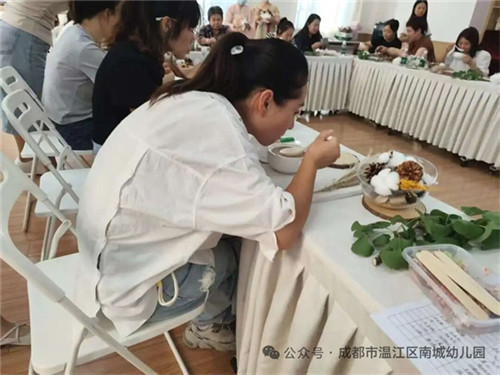 恰逢秋分至,活动现场还开展了秋分主题手作活动。家长们亲手制作秋分主题创意小摆件。松果、干花、枯枝、落叶……这些来自自然的材料在家长们的巧思中被重新组合,制成充满秋意的桌面摆件,定格节气的诗意。这一刻,节气不再是遥远的传统符号,而是通过双手可触、可感、可传承的生活美学,悄然浸润着每一个家庭的心灵。