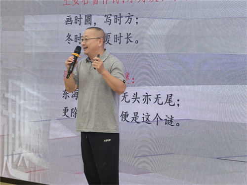作为文化载体,灯谜不仅是汉语言的艺术游戏,更藏着千年文脉的密码。课堂上,魏扬从古人谜趣切入,生动的故事瞬间点燃同学们的兴趣。随后,魏扬结合谜语与灯谜的区别,用“卯时到村前”等字谜例子,拆解灯谜。以汉字音、形、义为基础,善用别解、拆字的核心逻辑,让同学们明白民间谜语描形态、文义灯谜玩字趣的差异,更通过“格外大方”等字谜互动,引导大家动手拆解汉字结构,感受一笔一画皆玄机的乐趣。