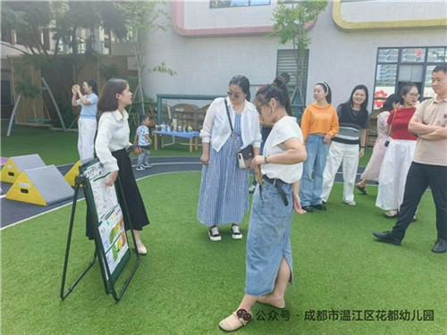 随后,王东梅带领家委们观摩了室外自主运动场景,从环境氛围、幼儿活动状态、运动游戏中幼儿的发展等方面进行了讲解。家委们不仅看到了孩子们的快乐,更读懂了运动场景背后的教育深意。