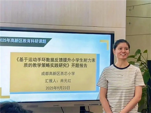 肖元红则结合体质健康现状和状态,分析了我国青少年的体质健康状况中存在的问题,并分析了智能运动手环在体质健康监测中的优势及预期成果。两位老师的汇报条理清晰、内容丰富,让与会人员对课题有了全面的认识。