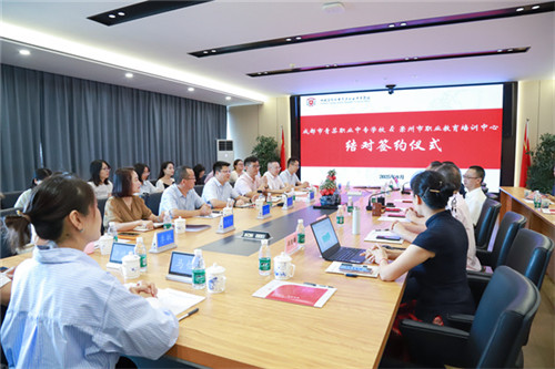 仪式现场,双方正式签署结对协议,明确了“五维合作”方向:一是管理互动,定期开展干部交流研讨,共享管理经验;二是教学优化,联合开发校本课程、共建教学资源库,提升教学质量;三是模式创新,联合备赛、共享师培,提升专业竞争力;四是文化互鉴,通过校园文化节、社团活动等交流,促进校园文化特色发展;五是办学融合,探索两区中职学校共建共享合作新模式。