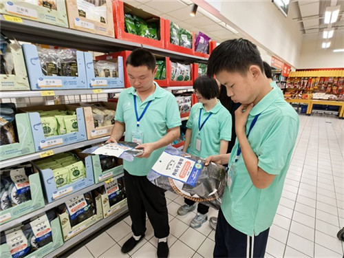 走进沃尔玛超市,学生们领取购物车后,立刻对照可视化购物清单,在食品区、日用品区穿梭寻找。率先找到物品的小组,便在阅读区一边看书,一边等待。直到所有小组找到商品后,他们在收银台有序排队,用手机完成付款,再认真将商品装袋——整个购物流程独立且规范,俨然一个个“资深小买家”。