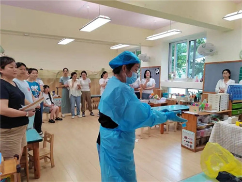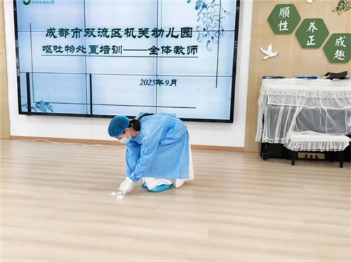 为提升教职工应对突发公共卫生事件的处置能力,9月中旬,成都市双流区机关幼儿园开展2025年秋季诺如病毒防控暨呕吐物处置应急演练。