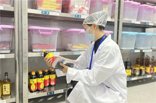 在食材储存间,清晨新鲜送达的蔬菜、肉类整齐摆放,粮油调料分类收纳,每一份食材都附有清晰的来源凭证与质检报告,真正实现“源头可溯、安全可查”。