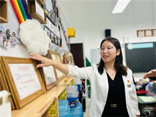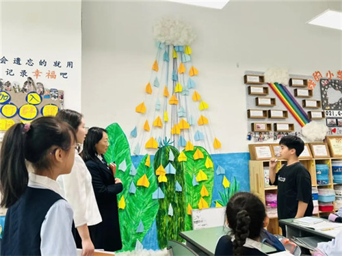 在学校班主任德育教研中,四年级李瑶老师代表年级组分享环创心得。她以“色彩是送给孩子的宇宙礼物”为理念,用海的湛蓝、星的璀璨与向阳的暖黄,为教育空间注入感受“乐”的温度。