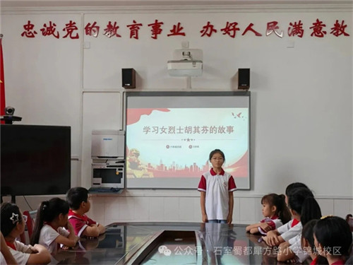 大队委员活动中,学习委员王骏瑶组织队员们开展了“英雄故事我来讲”活动,她用生动形象的语言向队员们介绍了烈士纪念日的由来和意义,女烈士胡其芬的感人故事,在少先队员的心灵中播撒下爱国主义的种子。大家神情专注,被英雄们的事迹深深打动。