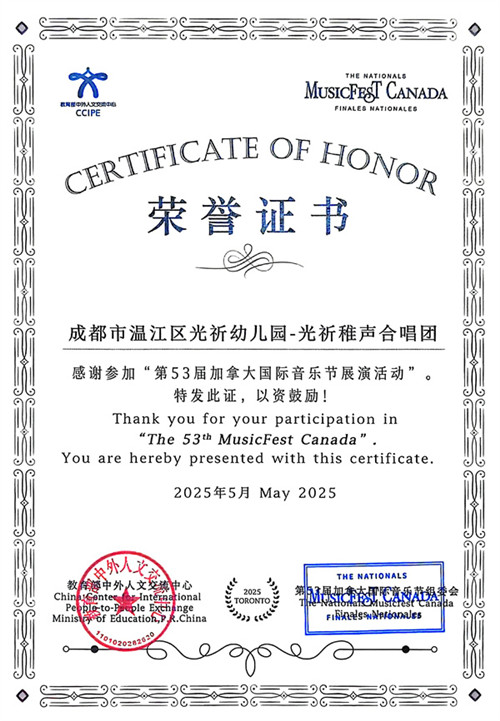 由教育部中外人文交流中心组织、加拿大国际音乐节组委会主办的第53届加拿大国际音乐节顺利落幕。成都市温江区光祈幼儿园“稚声合唱团”的两首兼具童趣与文化韵味的作品《爸爸妈妈叽里呱啦》《贡嘎山歌》以孩子们纯净自然的演绎打动海外评委,斩获线上展演国际金奖。