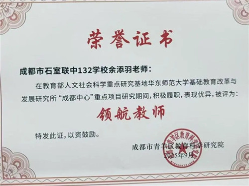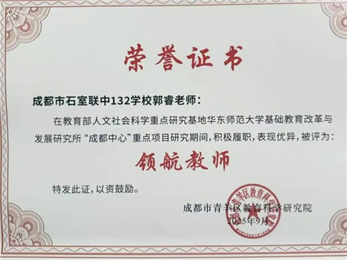9月25日上午,在“成都中心”项目成果表彰仪式上,石室联中郭睿、余添羽两位教师凭借在项目中的突出贡献,荣获“领航教师”称号。此次获奖不仅是对两位教师专业能力的肯定,更体现了石室联中在教师队伍建设与教育创新实践中的扎实成效。