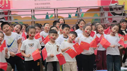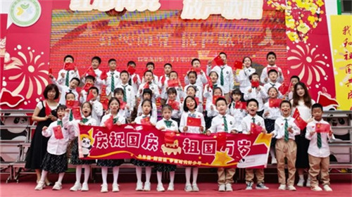在同学们的精彩展演后,行政和教师代表们走上舞台,带来合唱《今天是你的生日》。“今天是你的生日,我的中国,清晨我放飞一群白鸽……”老师们温柔而深情的歌声,不仅是对祖国母亲最真挚的祝福,更展现了学校教师“爱党爱国、立德树人”的初心。当歌声响起时,孩子们纷纷挥舞手中的小国旗,师生同唱一首歌的画面,成为现场最温暖的画面。