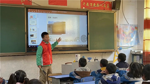 作为芳草小学非遗空竹的“小小传承者”,甘胤佑在吴晓丽老师的课堂中系统学习了空竹历史、技法及文化内涵。此次高原之行,从课程设计、资料搜集到准备PPT演示文稿,他都独立完成,并为授课班级全体小朋友带去了崭新的空竹。在甘孜州新龙县麻日乡中心小学的课堂上,他面向二年级学生,详细讲解了什么是非物质文化遗产以及空竹的历史和构造;在操场上,他通过分解动作演示、逐项要领拆解,让从未接触过空竹的藏族学生迅速掌握了“上扣”“加速”等基础技法;在大课间,他为全校师生带来了空竹表演,赢得阵阵掌声。