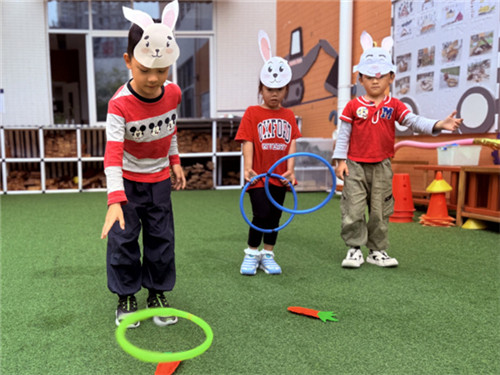 “月亮派对”上,孩子们玩出中秋新趣:穿汉服、提花灯,模仿“玉兔仙子”嬉戏,触摸古韵;握毛笔绘圆月、嫦娥与全家福,感受团圆;用彩泥捏玉兔、剪皮影、做“月饼”,将童趣融入传统;帮玉兔套“月光萝卜”、“捞月亮”,把桂香酿进茶包,在游戏中品中秋甜意。