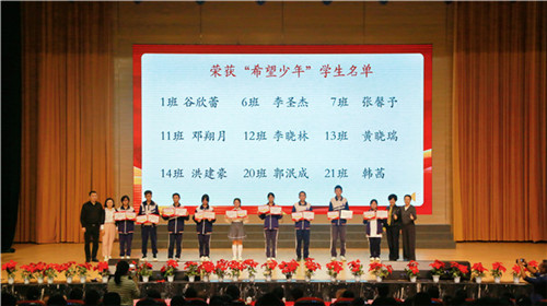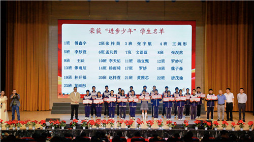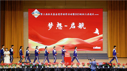 在“荣光・激励”环节,大弯中学初中学校校长魏林介绍往届获奖学生的优异发展成果,随后宣读第三届“粒米基金”获奖名单。伴随着激昂的乐曲,区教育局、工商联领导,商会企业家代表及学校领导分批上台,为荣获“希望少年”“进步少年”“卓越少年”称号的学子颁发奖学助学金与荣誉证书。台上学子自信昂扬的姿态,成为现场最生动的榜样名片。
