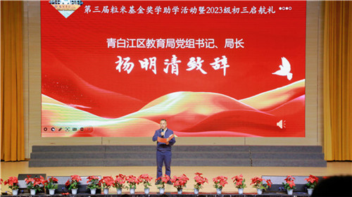 活动伊始,暖场视频《我们的足迹与荣光》带领现场观众回顾校园成长点滴,舞蹈《感恩有您》以深情演绎拉开仪式序幕。在庄严的氛围中,青白江区教育局局长杨明清率先发言,向获奖学子表示祝贺,并对即将开启毕业班生涯的初三学生提出殷切期望,鼓励他们以奋斗书写青春。
