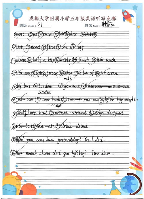 笔下有方寸,心中怀天下。活动中,四年级同学以笔为桨,在英语听写的海洋里,划向生活与成长的彼岸。同学们于“sweep”与“wash”间体悟劳动之美,于“run”与“jump”中感受拼搏之魂。一词一句,书写的是日常英语,涵养的却是修身齐家的责任与担当。孩子们工整的笔迹、专注的神情,正是对“一屋不扫,何以扫天下”这一古训的生动践行。