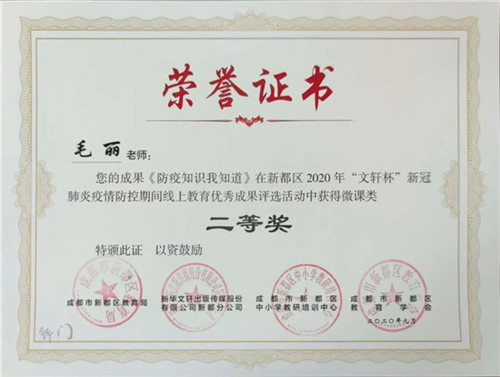 她制作的《防疫知识我知道》微课获区“文轩杯”线上教育成果二等奖,以灵活形式保障知识传递;校园影视作品《迎接蚕宝宝的到来》获四川省校园影视教育成果展示一等奖,将影视化教学融入科学探究。