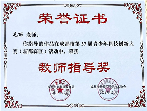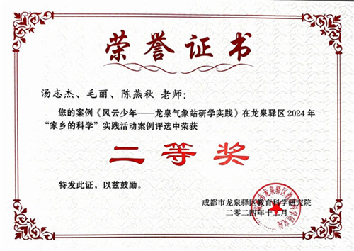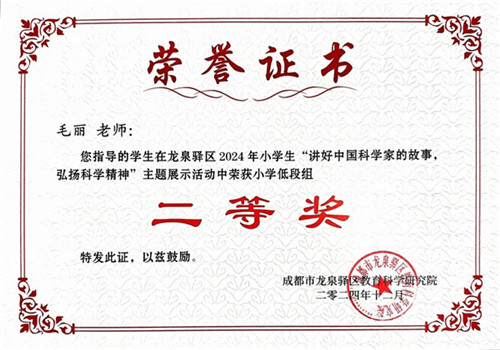 在指导学生成长方面,毛丽带领学生参与成都市第37届青少年科技创新大赛获教师指导奖,指导“讲好中国科学家的故事”活动获小学低段组二等奖,《风云少年——龙泉气象站研学实践》案例获龙泉驿区二等奖,将科学探究与实践育人深度结合。
